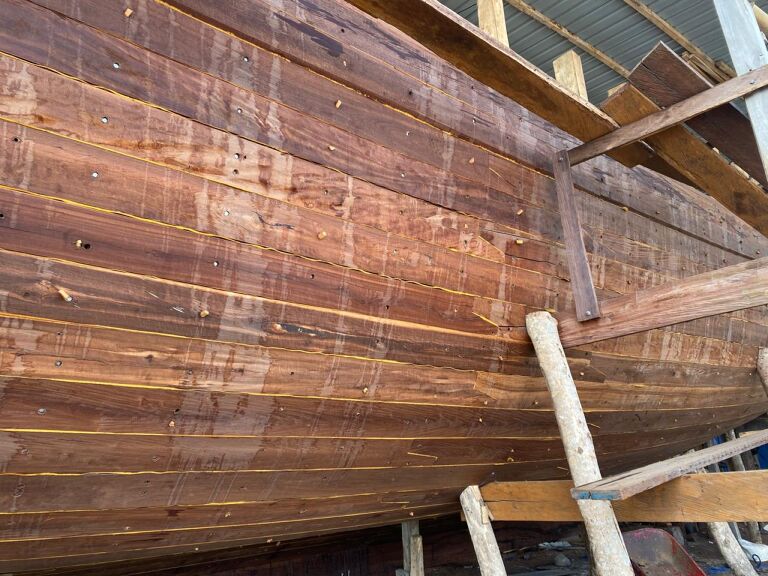 Papan lambung kapal biasanya menggunakan kayu ipil. Kayu ini memiliki kepadatan yang baik dan tahan terhadap perendaman air laut, namun tidak terlalu berat. Hal ini sejalan dengan prinsip desain kapal, di mana kulit kapal harus cukup kuat menahan tekanan hidrostatik tanpa menambah bobot berlebih.