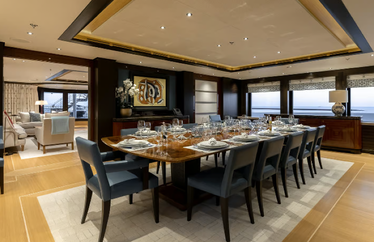 Bagian dalam yacht sering kali menyerupai hotel atau vila mewah di darat. Marmer impor, kayu eksotis, furnitur buatan tangan, hingga karya seni asli menjadi elemen umum. Beberapa yacht bahkan memiliki spa pribadi, bioskop, helipad, kolam renang, dan ruang bawah laut dengan dinding kaca.