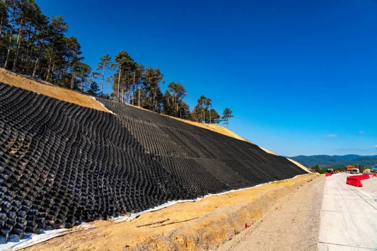 Pengendalian Erosi: Penggunaan geotekstil, rip-rap, atau shotcrete untuk melindungi permukaan lereng dari erosi akibat aliran air.