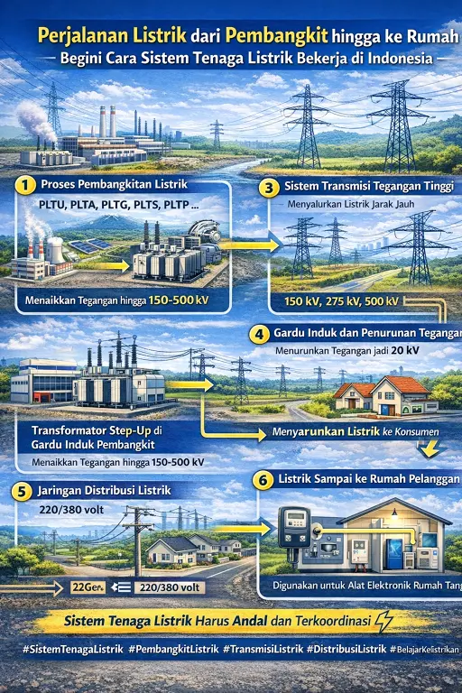Listrik merupakan kebutuhan utama dalam kehidupan modern. Hampir semua aktivitas manusia saat ini bergantung pada energi listrik, mulai dari penerangan rumah, penggunaan alat elektronik, hingga operasional industri besar. Namun, masih banyak masyarakat di Indonesia yang belum mengetahui bagaimana sebenarnya perjalanan listrik dari pembangkit hingga akhirnya sampai ke rumah mereka.