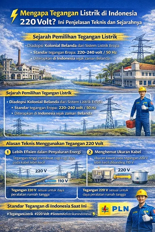 Penggunaan tegangan listrik 220 volt di Indonesia dipengaruhi oleh faktor sejarah sejak masa kolonial Belanda yang mengikuti standar Eropa. Selain itu, secara teknis tegangan 220 volt juga lebih efisien dalam penyaluran energi, dapat mengurangi rugi-rugi daya pada kabel, serta lebih cocok untuk kebutuhan peralatan listrik rumah tangga.