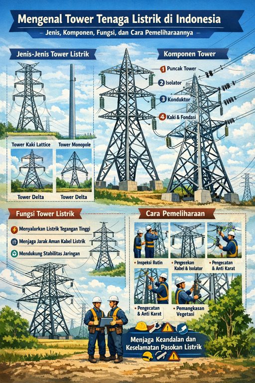 Mengingat luas wilayah Indonesia dan kondisi geografis yang beragam, desain dan jenis tower tenaga listrik pun dibuat berbeda-beda sesuai kebutuhan teknis dan lingkungan. Memahami jenis tower, komponen, fungsi, serta cara pemeliharaannya menjadi hal penting dalam menjaga keandalan sistem tenaga listrik nasional.