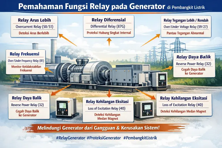 Relay pada generator pembangkit listrik memiliki peran krusial dalam menjaga keamanan dan keandalan sistem. Mulai dari proteksi arus lebih, diferensial, tegangan, frekuensi, hingga kehilangan eksitasi, setiap relay memiliki fungsi spesifik untuk mendeteksi gangguan tertentu. Dengan pemahaman yang baik mengenai fungsi relay dan koordinasi proteksi, operasional pembangkit dapat berjalan lebih aman, efisien, dan berkelanjutan.