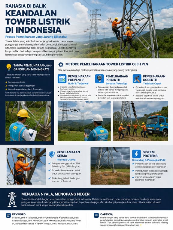 Dengan adanya pemeliharaan yang rutin dan terencana, tower listrik di Indonesia dapat beroperasi secara optimal dan mampu menyalurkan listrik secara stabil ke seluruh wilayah. Hal ini menjadi bukti bahwa di balik nyalanya lampu di rumah, terdapat kerja keras dan sistem yang kompleks yang terus dijaga keandalannya.