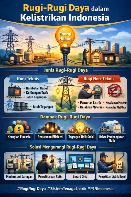 Rugi-rugi daya atau losses merupakan fenomena yang tidak dapat dihindari. Secara sederhana, rugi-rugi daya adalah selisih antara energi listrik yang dihasilkan di pembangkit dengan energi listrik yang benar-benar diterima oleh konsumen. Di Indonesia, yang memiliki sistem kelistrikan luas dan tersebar hingga ke pelosok daerah, rugi-rugi daya menjadi salah satu tantangan besar dalam menjaga efisiensi dan keandalan sistem.