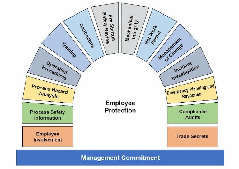 PSM berjalan dengan menggabungkan pemahaman teknologi dan manajemen untuk menjalankan keselamatan dan kesehatan kerja. Terdapat 14 elemen untuk menerapkan PSM, yaitu