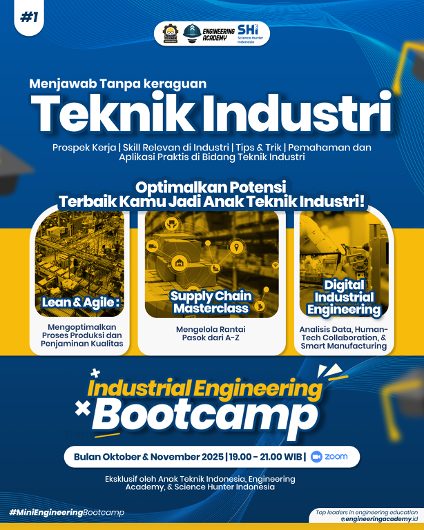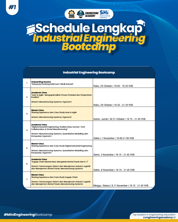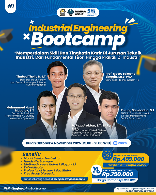 Mini Bootcamp Industrial Engineering hadir untukmu! Selama 3 Minggu , kamu akan dilatih langsung oleh Akademisi dari Institut Ternama di Indonesia untuk dapatkan fondasi ilmu yang kuat dan Praktisi Ahli dari Industri untuk Pelajari studi kasus nyata dan best practice di industri. Serta bakal dapat project hingga penugasan yang di bimbing oleh fasilitator berpengalaman di bidang industri secara 1 on 1.