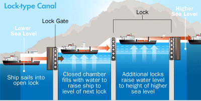 Lalu, kenapa gerbang di Terusan Panama dibuat bertingkat? Karena Terusan Panama membelah daratan tinggi, serta melewati Danau Gatun yang berada 26 meter di atas permukaan laut. Jadi, kapal yang melewati terusan ini seperti "naik gunung" sebagaimana ditunjukkan gambar di bawah ini: