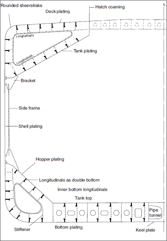 Pelat tank top dan outer bottom disatukan oleh struktur pelat vertikal yang disebut plate floor. Longitudinal framing digunakan untuk wing tank dan alas ganda, sedangkan transverse framing (konstruksi melintang) digunakan untuk konstruksi sisi. Bulk carrier juga dilengkapi oleh lightening hole dan man hole. Sudut atas bulk carrier dilengkapi dengan sekat miring, dan ruang ini digunakan untuk menyimpan jenis kargo lain atau untuk penyimpanan ballast air. Tangki ini disebut juga sebagai top wing tank.