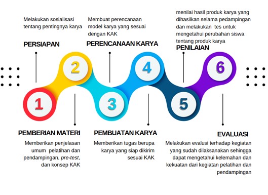 Pendampingan dilakukan secara rutin dan terjadwal setiap minggu dengan alokasi waktu 90 menit, siswa juga diberikan kesempatan untuk berdiskusi langsung dengan tim pengabdian lewat komunikasi elektronik apabila ada kesulitas di luar jadwal rutin pendampingan. Tujuan akhir dari pendampingan adalah untuk membantu siswa untuk menyesaikan produk dari karya ilmiah, dimana pada akhir kegiatan dapat dievaluasi mengenai tingkat prosentasi keberhasilan siswa dalam membuat produk karya ilmiah yang sesuai.